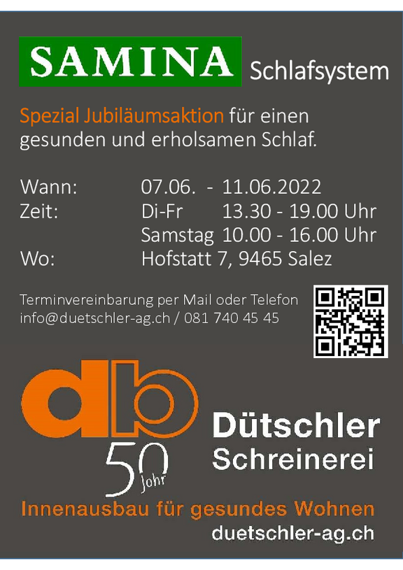 Zum 50 Jahr Jubiläum lädt die Firma Dütschler AG vom 07.06 – 11.06.2022 zur Samina Schlafsystem Aktion ein. Profitieren Sie von attraktiven Konditionen, wir freuen uns auf Ihre Kontaktaufnahme.