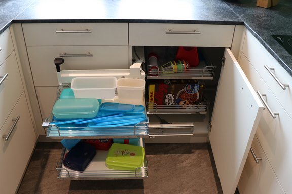 Helle und ergonomische Küche mit vielen cleveren Details. Für optimale Platzausnutzung wurde im Eckschrank der PEKA Magic Corner eingebaut. Backofen und Steamer sind bequem auf Arbeitshöhe montiert. Für zusätzlichen Stauraum wurden in der Halbinsel beidseitig Schränke eingebaut.